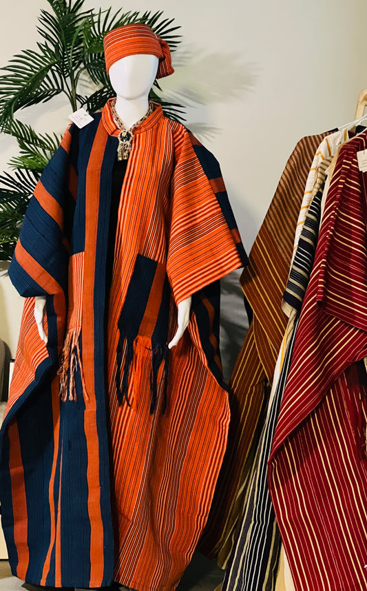 We work with 100% cotton, luxurious handwoven Aso Oke, and vibrant tie & dye fabrics, creating garments that are as unique as the people who wear them. Our designs are thoughtfully crafted—flowing silhouettes, rich textures, and intentional details that honor tradition while embracing modernity.